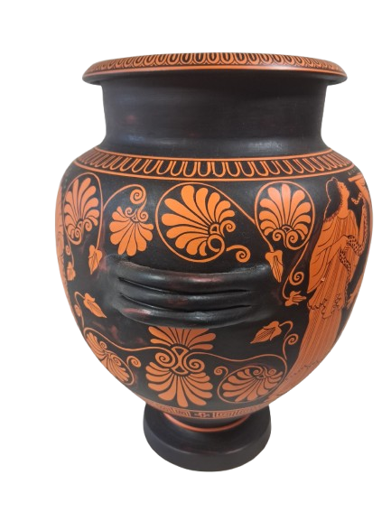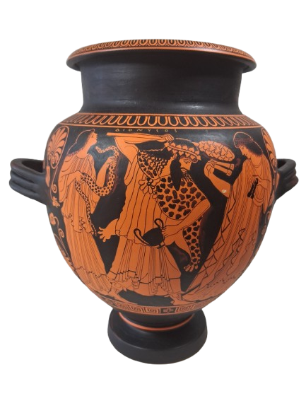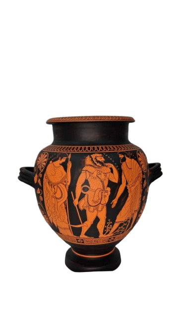 The composition is marked by refined drawing, subtle added colour, and balanced structure, making this stamnos a fine example of early Classical narrative vase painting. It masterfully merges heroic and Dionysian themes, creating a vibrant and mythologically rich visual experience.