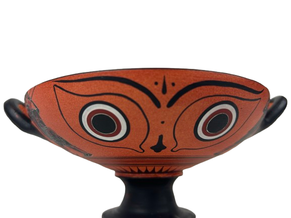The exterior decoration features fighting warriors, a central nose motif between large apotropaic eyes, and fallen warriors beneath the handles. The intense gaze of the eye motif is thought to ward off evil during the symposium. The composition exhibits masterful drawing, narrative symbolism, and ritual purpose.