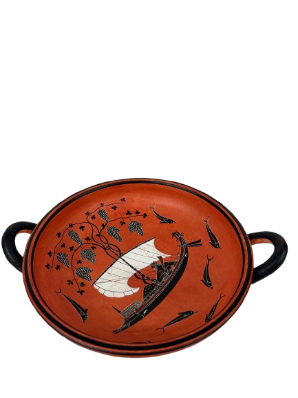 In the interior (tondo), Dionysos reclines aboard a warship, surrounded by dolphins and a grapevine laden with bunches of grapes that miraculously grows from the mast. The image draws inspiration from the Homeric Hymn to Dionysus, where the god performs divine miracles to reveal his identity to pirates. The presence of dolphins and vines highlights the transformational and ecstatic nature of the god.