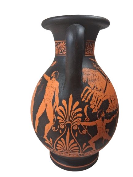 The composition reveals lively rhythm, narrative layering, and expressive detail — typical of the Kadmos Painter. The myth is rendered as a transition from hero to god, merging ritual, heroism, and deification into a unified visual narrative.