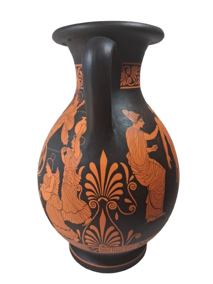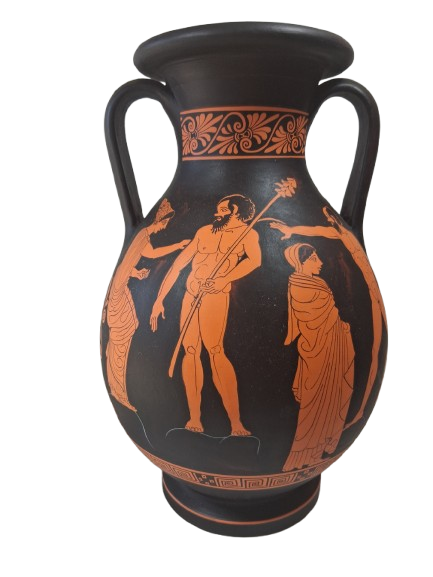 Athenian red-figure pelike, dated to ca. 450–400 BCE, attributed to the Kadmos Painter, according to Beazley. The vase was found in Vulci, Etruria, and is currently housed in the Staatliche Antikensammlungen in Munich.