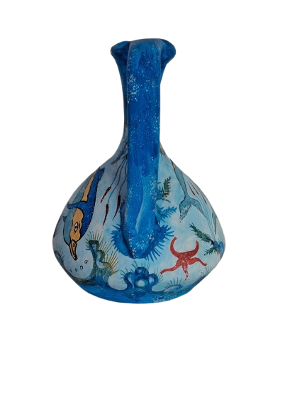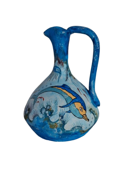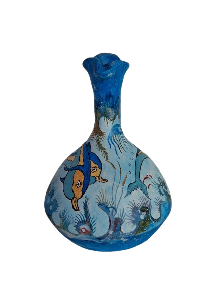 Despite the evident Minoan inspiration in both form and decoration, this particular vessel is a modern creation that aims to revive the aesthetic and stylistic features of Minoan culture. Although it resembles an oinochoe—originally intended primarily for serving wine—it serves a purely decorative purpose today, without any functional role in religious or daily usage. The vibrancy of the colours, the dynamic portrayal of dolphins, and the emphasis on marine imagery underscore the Minoans’ close relationship with the sea, while also demonstrating the enduring appeal of Minoan art into the present.