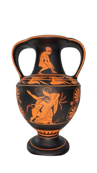 This amphora belongs to the characteristic Nikosthenic “Louvre” type, with a narrow neck, balanced proportions, and strong visual storytelling. It is a key example of early red-figure painting featuring Dionysian themes and theatrical intensity.