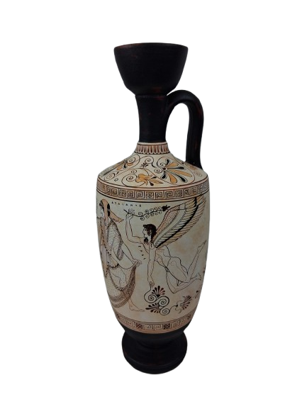 Athenian red-figure lekythos with white ground, dated to the early Classical period (ca. 500–450 BCE), attributed to the vase-painter Douris. It is now part of the Cleveland Museum of Art collection.