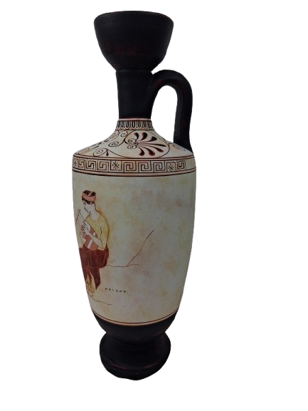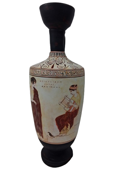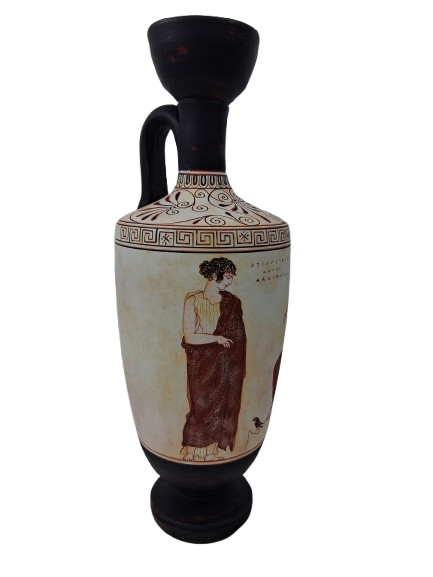 Athenian red-figure lekythos with white ground, dated to ca. 475–425 BCE, attributed to the Achilles Painter, one of the most refined vase painters of the Classical period. The lekythos originates from Greece and is currently held in the State Collection of Antiquities in Munich (Antikensammlungen, Munich).