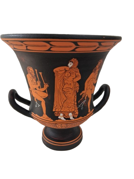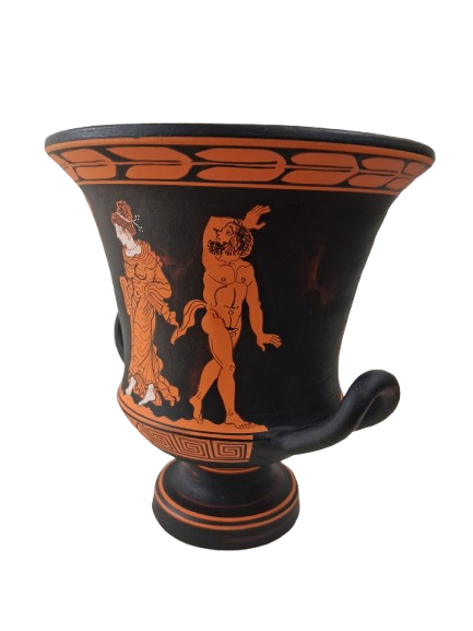 Athenian red-figure calyx krater with added colour, dated between 400 and 300 BCE, was found in Thebes, Boeotia, and belongs to the late Classical or early Hellenistic period. It is currently housed in the Antikensammlungen in Munich.
